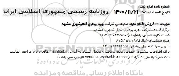 آگهی مزایده 161 فروش اقلام مازد مازاد ضایعاتی شرکت بهره برداری قطارشهری مشهد