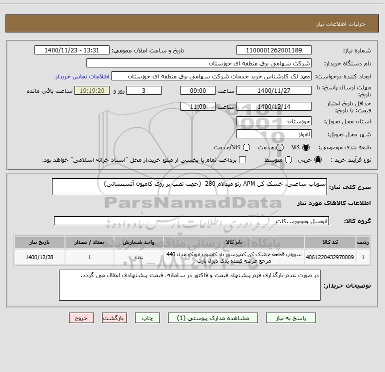 شرح کلی نیاز: سوپاپ ساعتی، خشک کن APM رنو میدلام 280 (جهت نصب بر روی کامیون آتشنشانی)