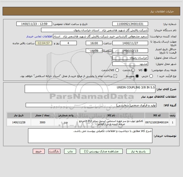 شرح کلی نیاز: UNION COUPLING 3/8 IN S.S