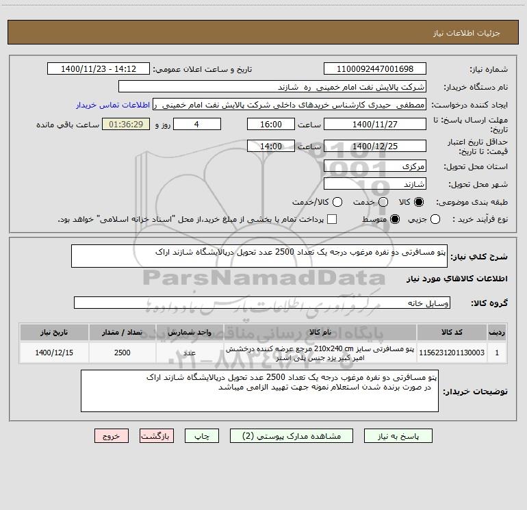 شرح کلی نیاز: پتو مسافرتی دو نفره مرغوب درجه یک تعداد 2500 عدد تحویل درپالایشگاه شازند اراک