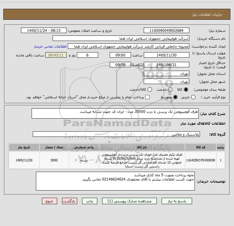 شرح کلی نیاز: ظرف آلومینیومی تک پرسی با درب 35000 عدد - ایران کد جهت تشابه میباشد