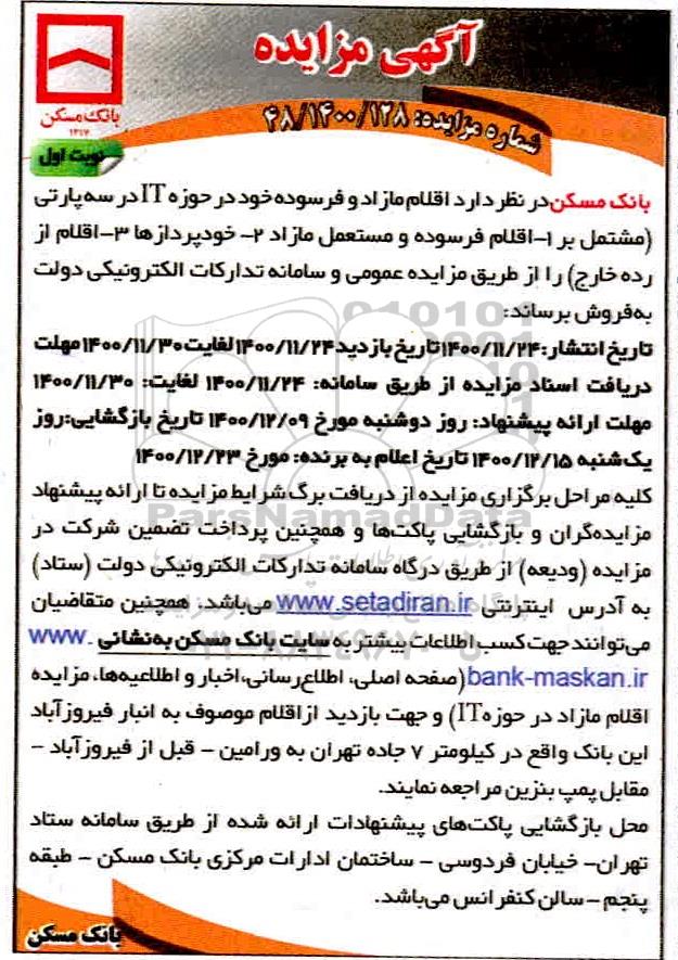 بانک مسکن در نظر دارد اقلام مازاد و فرسوده خود در حوزه IT در سه پارتی مشتمل بر 1- اقلام فرسوده و مستعمل مازاد 2- خودپردازها 3- اقلام از رده خارج) را از طریق مزایده عمومی و سامانه تدارکات الکترونیکی دولت به فروش برساند