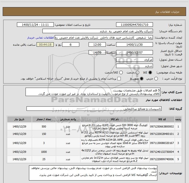 شرح کلی نیاز: 5 قلم اتصالات طبق مشخصات پیوست.