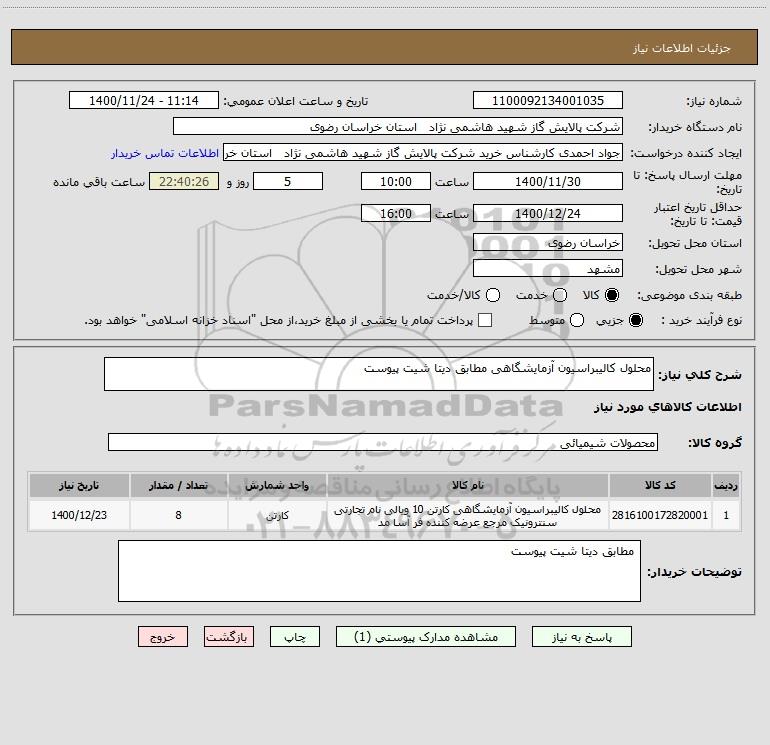 نام دستگاه خریدار:شرکت پالایش گاز شهید هاشمی نژاد استان خراسان رضوی