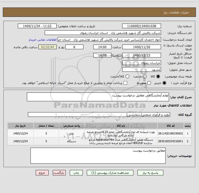نام دستگاه خریدار:شرکت پالایش گاز شهید هاشمی نژاد استان خراسان رضوی