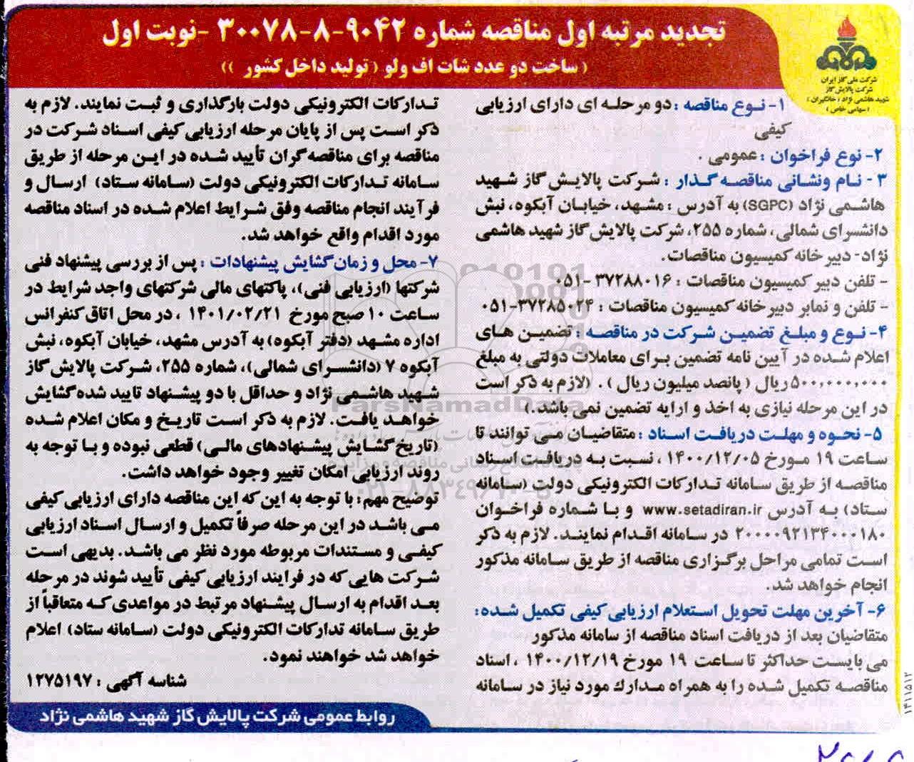3- نام و نشانی مناقصه گزار: شرکت پالایش گاز شهید هاشمی نژاد (SGPC) به ادرس: مشهد خیابان آبکوه نبش دانشسرای شمالی شماره 255 شرکت پالایش گاز شهید هاشمی نژاد - دبیرخانه کمیسیون مناقصات معاملات