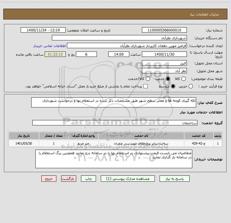 شرح کلی نیاز: لکه گیری کوچه ها و معابر سطح شهر طبق مشخصات ذکر شده در استعلام بها و درخواست شهرداری