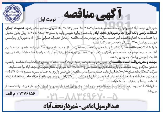شهرداری نجف آباد در نظر دارد عملیات اجرای آسفالت تراشی و لکه گیری معابر شهرداری نجف آباد را با مجموع برآورد تقریبی اولیه به مبلغ 12.679.658.196 ریال بدون تعدیل و با احتساب مابه التفاوت قیمت قیر حسب مدارک موجود در مدارک مناقصه از محل اعتبارات عمرانی سال 1400 به شهرداری و براساس فهرست بها سال 1400 پیمانکار واجد شرایط واگذار نماید.