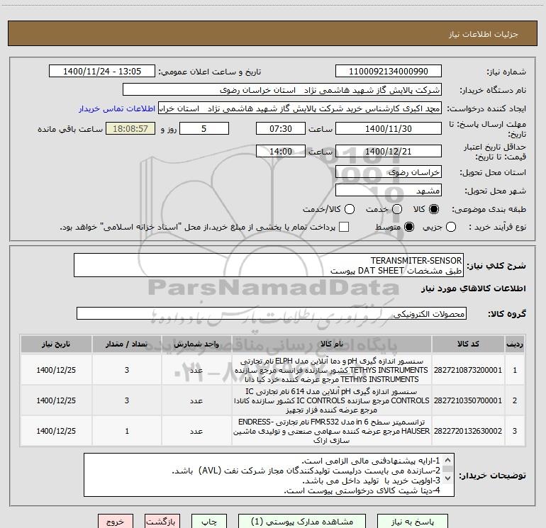 شرح کلی نیاز: TERANSMITER-SENSOR