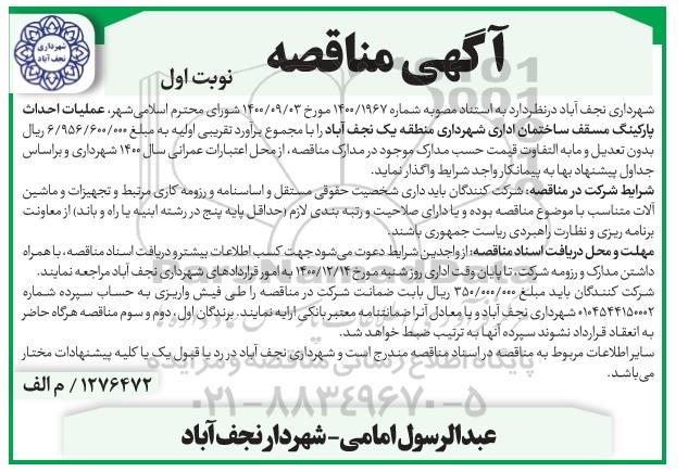 شهرداری نجف آباد در نظر دارد عملیات احداث پارکینگ مسقف ساختمان اداری شهرداری منطقه یک نجف آباد