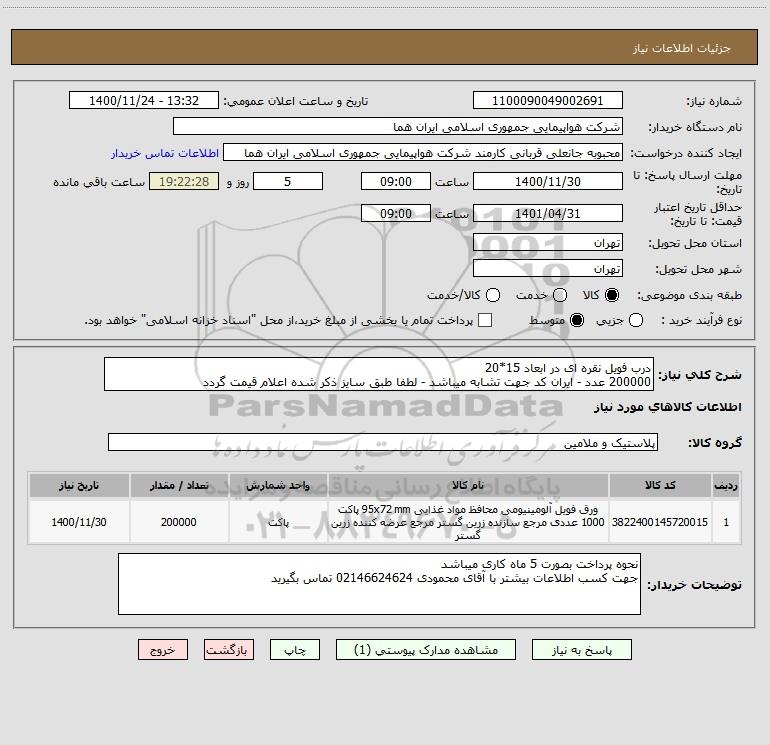 استعلام درب فویل نقره ای در ابعاد 15*20 200000 عدد - ایران کد جهت تشابه میباشد - لطفا طبق سایز ذکر شده اعلام قیمت گردد, استعلام درب فویل نقره ای در ابعاد 15*20 200000 عدد - ایران کد جهت تشابه میباشد - لطفا طبق سایز ذکر شده اعلام قیمت گردد