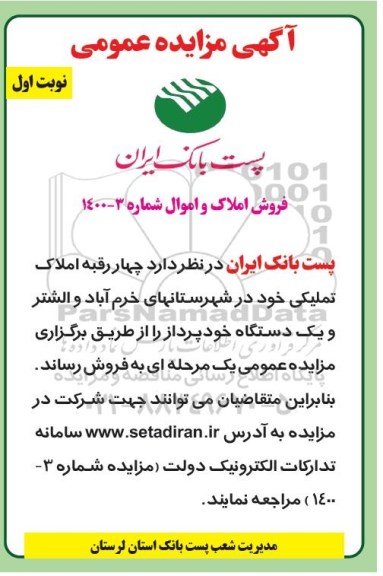مزایده عمومی مزایده فروش املاک و اموال برگزار میگردد. از کلیه افراد متخصص و شرکت‌های واجد شرایط دعوت به عمل می‌آید تا در این مزایده با کد خبرگزاری پارس نماد : 4258293 شرکت نمایند تاریخ شروع مزایده : 1400/11/24 مهلت شرکت در مزایده: تا پایان روز 1400/12/14 مکان برگزاری اموال واگذاری استان‌های لرستان و دسته‌بندی‌های مربوط به این حراجی کامپیوتر, املاک و زمین میباشد.