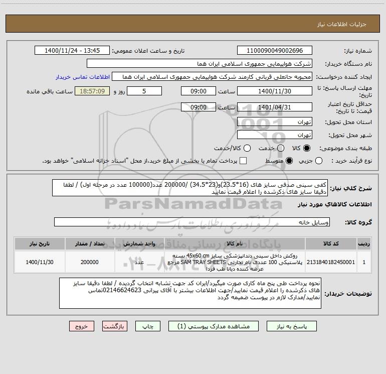 شرح کلی نیاز: کفی سینی صدفی سایز های (16*23.5)و(23*34.5) /200000 عدد(100000 عدد در مرحله اول) / لطفا دقیقا سایز های ذکرشده را اعلام قیمت نمایید