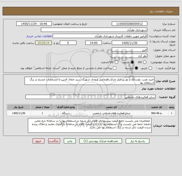 شرح کلی نیاز: خرید نصب ،نوسازی و نور پردازی چراغ راهنمایی ورودی شهرک سید جمال الدین با مشخصات مندرج در برگ استعلام بها