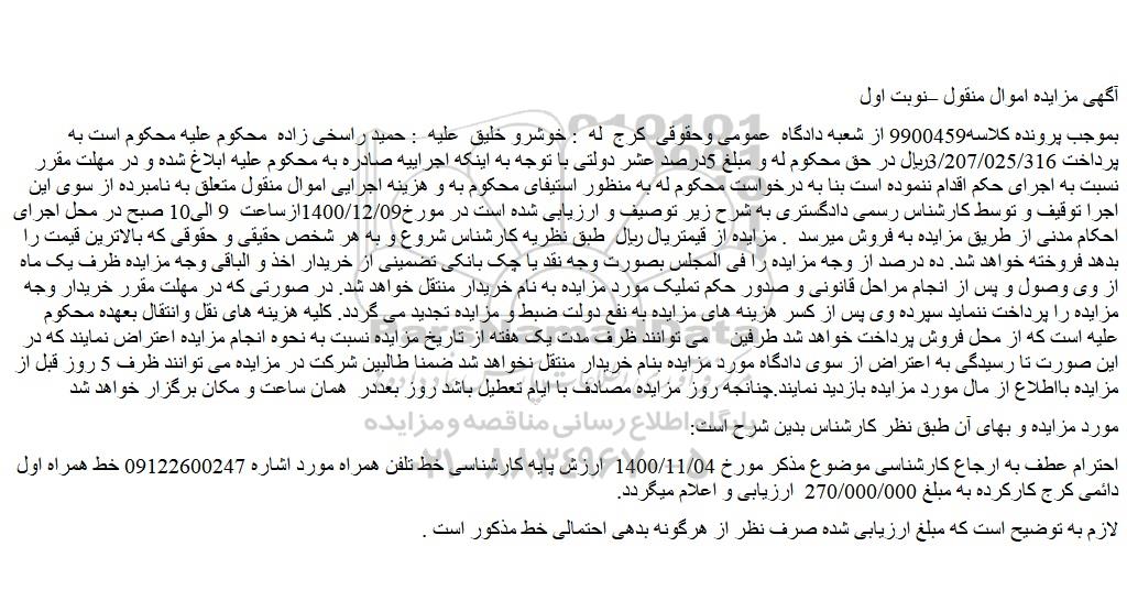 بموجب پرونده کلاسه9900459 از شعبه دادگاه عمومی وحقوقی کرج له : خوشرو خلیق علیه : حمید راسخی زاده محکوم علیه محکوم است به پرداخت 3/207/025/316ریال در حق محکوم له و مبلغ 5درصد عشر دولتی با توجه به اینکه اجراییه صادره به محکوم علیه ابلاغ شده و در مهلت مقرر نسبت به اجرای حکم اقدام ننموده است بنا به درخواست محکوم له به منظور استیفای محکوم به و هزینه اجرایی اموال منقول متعلق به نامبرده از سوی این اجرا توقیف و توسط کارشناس رسمی دادگستری به شرح زیر توصیف و ارزیابی شده است در مورخ1400/12/09ازساعت 9 الی10 صبح در محل اجرای احکام مدنی از طریق مزایده به فروش میرسد . مزایده از قیمتریال ریال طبق نظریه کارشناس شروع و به هر شخص حقیقی و حقوقی که بالاترین قیمت را بدهد فروخته خواهد شد. ده درصد از وجه مزایده را فی المجلس بصورت وجه نقد یا چک بانکی تضمینی از خریدار اخذ و الباقی وجه مزایده ظرف یک ماه از وی وصول و پس از انجام مراحل قانونی و صدور حکم تملیک مورد مزایده به نام خریدار منتقل خواهد شد. در صورتی که در مهلت مقرر خریدار وجه مزایده را پرداخت ننماید سپرده وی پس از کسر هزینه های مزایده به نفع دولت ضبط و مزایده تجدید می گردد. کلیه هزینه های نقل وانتقال بعهده محکوم علیه است که از محل فروش پرداخت خواهد شد طرفین می توانند ظرف مدت یک هفته از تاریخ مزایده نسبت به نحوه انجام مزایده اعتراض نمایند که در این صورت تا رسیدگی به اعتراض از سوی دادگاه مورد مزایده بنام خریدار منتقل نخواهد شد ضمنا طالبین شرکت در مزایده می توانند ظرف 5 روز قبل از مزایده بااطلاع از مال مورد مزایده بازدید نمایند.چنانجه روز مزایده مصادف با ایام تعطیل باشد روز بعددر همان ساعت و مکان برگزار خواهد شد