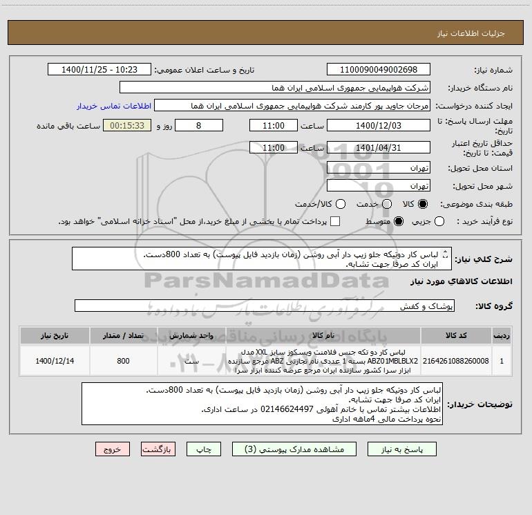 شرح کلی نیاز: لباس کار دوتیکه جلو زیپ دار آبی روشن (زمان بازدید فایل پیوست) به تعداد 800دست.