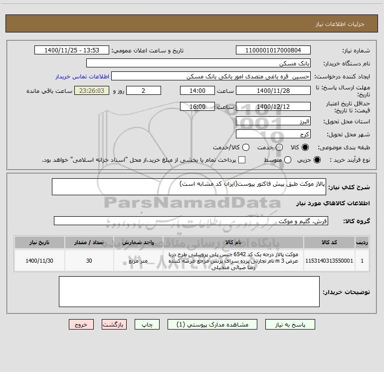 شرح کلی نیاز: پالاز موکت طبق پیش فاکتور پیوست(ایران کد مشابه است)