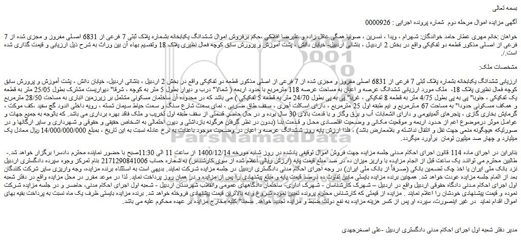 خواهان :خانم مهری عطار حامد خواندگان: شهرام ، ویدا ، نسرین ، صونیا همگی عاقل زاده و علیرضا افلاکی ،حکم برفروش اموال ششدانگ یکبابخانه بشماره پلاک ثبتی 7 فرعی از 6831 اصلی مفروز و مجزی شده از 7 فرعی از اصلی مذکور قطعه دو تفکیکی واقع در بخش 2 اردبیل ، بنشانی اردبیل- خیابان دانش ، پشت آموزش و پرورش سابق کوچه فعال نظیری پلاک 18 وتقسیم بهاء آن بین وراث به شرح ذیل ارزیابی و قیمت گذاری شده است./.