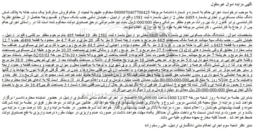 به موجب درخواست اجرای حکم به شماره و شماره دادنامه مربوطه 9909970407700425 محکوم علیهم به تبعیت از حکم فروش ماترک( یک باب خانه به پلاک شش دانگ ملک مسکونی و تجاری بشماره 6495 بخش 2 اردبیل بشماره ثبت 1581 واقع در اردبیل - خیابان نائبی جنب بانک سپه) و تقسیم وجه حاصل از آن مطابق نظریه کارشناسی برابر قانون ارث بین وراث مرحوم مظفر سرشکی ومبلغ 1/000/000ریال بابت نیم عشردولتی درحق صندوق دولت محکوم شده است لذا در راستای اجرای حکم پس از ارجاع به کارشناسی ، کارشناس مربوطه نظریه خود را به شرح زیر اعلام نمودند: