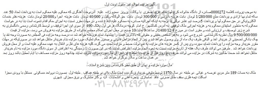 به موجب پرونده کلاسه 0000272صادره از دادگاه خانواده کرج لها: خانم فریبا صفری با وکالت پرویز سمیع زاده علیه: آذردوخت آهنگری که محکوم علیه محکوم است به پرداخت تعداد 50 عدد سکه تمام بها ازادی و پرداخت مبلغ 1/280/000 تومان بابت هزینه دادرسی و 300/000 تومان بابت حق الوکاله وکیل و 40/000 تومان بابت هزینه اجرا و20/000 تومان بابت هزینه دفتر خدمات الکترونیکی در حق محکوم لها و پرداخت 5درصد نیم عشر دولتی با توجه به اینکه اجرائیه صادره به محکوم علیه ابلاغ شده و در مهلت مقرر نسبت به اجرای حکم اقدام ننموده است بنا به در خواست محکوم له به منظور استیفای محکوم به و هزینه اجرایی ملک توقیفی به آدرس کمالشهر خ امام کوچه درمانگاه فرعی اول پلاک 490 از سوی این اجرا توقیف و توسط کارشناس رسمی دادگستری به شرح زیر توصیف و ارزیابی شده و مقرر است در مورخ 1400/12/4از ساعت9 لغایت10 صبح در محل اجرای احکام مجتمع خانواده از طریق مزایده به فروش می رسد، مزایده از قیمت 9/500/000/000 ریال نظریه کارشناسی شروع می شود و به هر شخص حقیقی و حقوقی که بالاترین قیمت را پیشنهاد نماید فروخته خواهد شد ده درصد وجه مزایده فی المجلس به صورت وجه نقد یا چک بانکی تضمینی از خریدار اخذ و الباقی ظرف یک ماه از وی وصول خواهد شد و پس از انجام مراحل قانونی و صدور حکم تملیک مورد مزایده بنام خریدار منتقل خواهد شد در صورتیکه در مهلت مقرر خریدار وجه مزایده را پرداخت ننماید سپرده وی پس از کسر هزینه های مزایده به نفع دولت ضبط و مزایده تجدید می گردد کلیه هزینه های نقل و انتقال به عهده محکوم علیه است و از محل فروش پرداخت خواهد شد . طرفین می توانند ظرف یک هفته از تاریخ مزایده نسبت به نحوه انجام مزایده اعتراض نمایند که در این صورت تا رسیدگی به اعتراض از سوی دادگاه مورد مزایده به نام خریدار منتقل نخواهد شد ضمنا طالبین به شرکت در مزایده می توانند ظرف پنج روز قبل از مزایده با اطلاع این اجرا از مال مورد مزایده بازدید نمایند چنانچه روز مزایده مصادف با ایام تعطیل باشد روز بعد در همان ساعت و مکان برگزار خواهد شد .