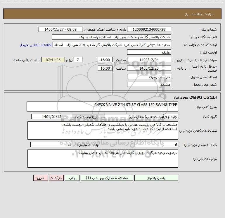 نام دستگاه خریدار:شرکت پالایش گاز شهید هاشمی نژاد استان خراسان رضوی