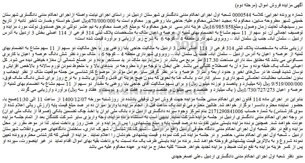 شماره پرونده اجرایی: کلاسه 0000544 شعبه اول اجرای احکام مدنی دادگستری شهرستان اردبیل در راستای اجرای نیابت واصله ازاجرای احکام مدنی دادگستری شهرستان خمینی شهر مطروحه مابین، محکوم له :مجید اعلائی.محکوم علیه: حاجی بابا روغنی پور محکوم است به 470/000/000ریال اصل خواسته وخسارت تاخیر تادیه از تاریخ سررسیدچک لغایت زمان وصول ومبلغ16/985/858ریال هزینه دادرسی درحق محکوم له ،ومبلغ 5درصد محکوم به نیم عشر دولتی درحق صندوق دولت مورد مزایده و توصیف اجمالی آن: دو سهم از 11 سهم مشاع به انضمام بهای ثمنیه از عرصه و اعیان ملک به مشخصات پلاک ثبتی 314 فرعی از 114 اصلی بخش 3 اردبیل به آدرس اردبیل – سلمان آباد- جنب پل سلمان آباد – روبروی شهرداری منطقه 4 – کوچه 6 به شرح زیر ارزیابی و برآورد قیمت شده است؛