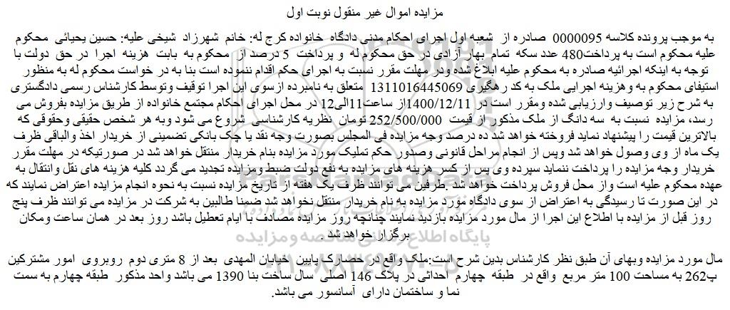به موجب پرونده کلاسه 0000095 صادره از شعبه اول اجرای احکام مدنی دادگاه خانواده کرج له: خانم شهرزاد شیخی علیه: حسین یحیائی محکوم علیه محکوم است به پرداخت480 عدد سکه تمام بهار آزادی در حق محکوم له و پرداخت 5 درصد از محکوم به بابت هزینه اجرا در حق دولت با توجه به اینکه اجرائیه صادره به محکوم علیه ابلاغ شده ودر مهلت مقرر نسبت به اجرای حکم اقدام ننموده است بنا به در خواست محکوم له به منظور استیفای محکوم به وهزینه اجرایی ملک به کد رهگیری 1311016445069 متعلق به نامبرده ازسوی این اجرا توقیف وتوسط کارشناس رسمی دادگستری به شرح زیر توصیف وارزیابی شده ومقرر است در 1400/12/11از ساعت11الی12 در محل اجرای احکام مجتمع خانواده از طریق مزایده بفروش می رسد، مزایده نسبت به سه دانگ از ملک مذکور از قیمت 252/500/000 تومان نظریه کارشناسی شروع می شود وبه هر شخص حقیقی وحقوقی که بالاترین قیمت را پیشنهاد نماید فروخته خواهد شد ده درصد وجه مزایده فی المجلس بصورت وجه نقد یا چک بانکی تضمینی از خریدار اخذ والباقی ظرف یک ماه از وی وصول خواهد شد وپس از انجام مراحل قانونی وصدور حکم تملیک مورد مزایده بنام خریدار منتقل خواهد شد در صورتیکه در مهلت مقرر خریدار وجه مزایده را پرداخت ننماید سپرده وی پس از کسر هزینه های مزایده به نفع دولت ضبط ومزایده تجدید می گردد کلیه هزینه های نقل وانتقال به عهده محکوم علیه است واز محل فروش پرداخت خواهد شد .طرفین می توانند ظرف یک هفته از تاریخ مزایده نسبت به نحوه انجام مزایده اعتراض نمایند که در این صورت تا رسیدگی به اعتراض از سوی دادگاه مورد مزایده به نام خریدار منتقل نخواهد شد ضمنا طالبین به شرکت در مزایده می توانند ظرف پنج روز قبل از مزایده با اطلاع این اجرا از مال مورد مزایده بازدید نمایند چنانچه روز مزایده مصادف با ایام تعطیل باشد روز بعد در همان ساعت ومکان برگزار خواهد شد .