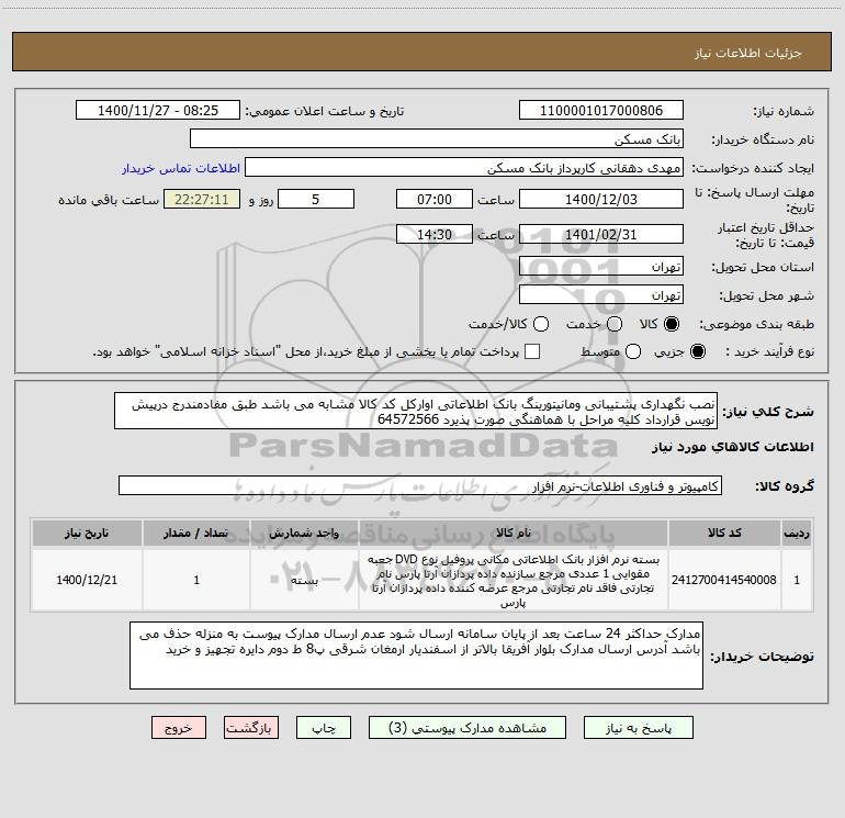 شرح کلی نیاز: نصب نگهداری پشتیبانی ومانیتورینگ بانک اطلاعاتی اوارکل کد کالا مشابه می باشد طبق مفادمندرج درپیش نویس قرارداد کلیه مراحل با هماهنگی صورت پذیرد 64572566