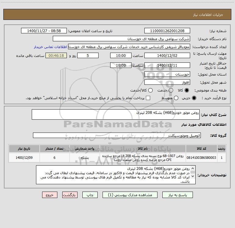 شرح کلی نیاز: روغن موتور خودرو(H68) بشکه 208 لیتری
