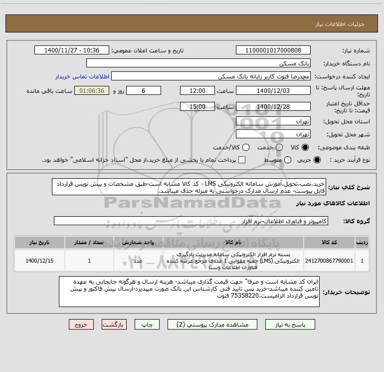 شرح کلی نیاز: خرید،نصب،تحویل،آموزش سامانه الکترونیکی LMS - کد کالا مشابه است-طبق مشخصات و پیش نویس قرارداد فایل پیوست- عدم ارسال مدارک درخواستی به منزله حذف میباشد.