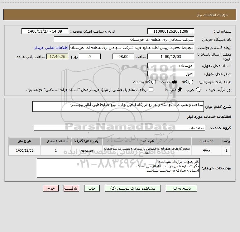 شرح کلی نیاز: ساخت و نصب درب دو لنگه و نفر رو قرارگاه اربعین وزارت نیرو چذابه(طبق آنالیز پیوست)