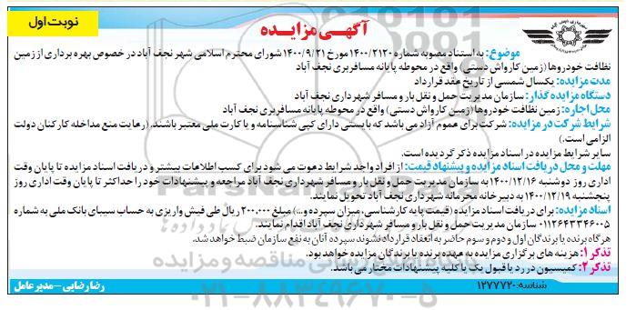 موضوع: به استناد مصوبه شماره 1400/2120 مورخ 1400.9.21 شورای محترم اسلامی شهر نجف آباد در خصوص بهره برداری از زمین نظافت خودروها (زمین کارواش دستی) واقع در ترمینال مسافربری نجف اباد