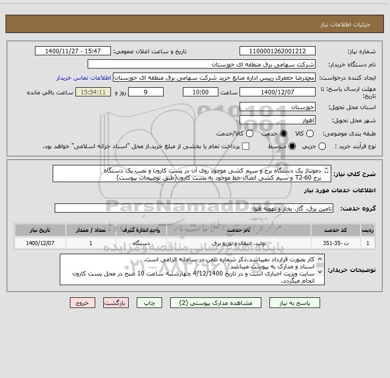 شرح کلی نیاز: دمونتاژ یک دستگاه برج و سیم کشی موجود روی آن در پست کارون و نصب یک دستگاه