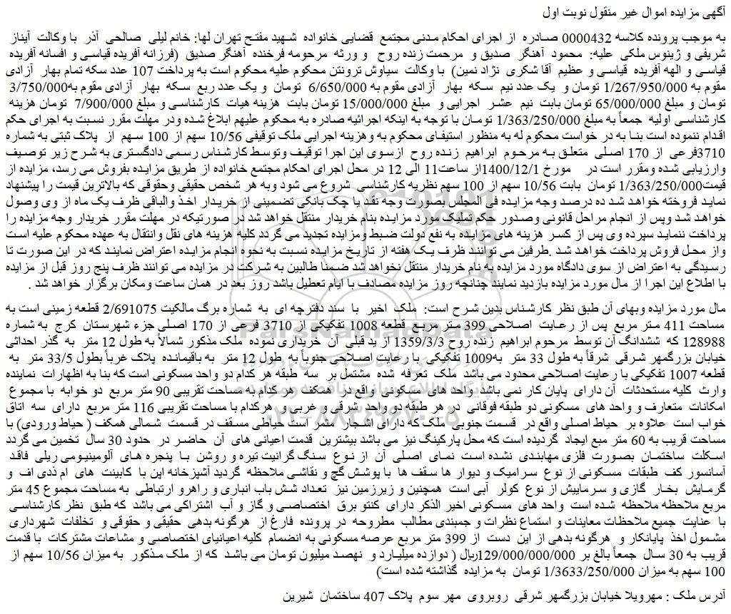 به موجب پرونده کلاسه 0000432 صادره  از اجرای احکام مدنی مجتمع  قضایی خانواده  شهید مفتح تهران لها: خانم لیلی  صالحی  آذر  با وکالت  آیناز  شریفی و ژینوس ملکی  علیه:  محمود  آهنگر  صدیق و  مرحمت زنده روح   و ورثه  مرحومه فرخنده  آهنگر صدیق  (فرزانه آفریده قیاسی و افسانه آفریده  قیاسی و الهه آفریده  قیاسی و عظیم  آقا شکری  نژاد نمین)  با وکالت  سیاوش ترونتن محکوم علیه محکوم است به پرداخت 107 عدد سکه تمام بهار  آزادی مقوم به 1/267/950/000 تومان و  یک عدد نیم  سکه  بهار  آزادی مقوم به 6/650/000  تومان  و یک عدد ربع  سکه  بهار  آزادی مقوم به3/750/000  تومان و مبلغ 65/000/000 تومان بابت  نیم  عشر  اجرایی و  مبلغ 15/000/000 تومان بابت  هزینه هیات  کارشناسی و مبلغ 7/900/000  تومان هزینه  کارشناسی اولیه  جمعاً به مبلغ 1/363/250/000 تومان با توجه به اینکه اجرائیه صادره به محکوم علیهم ابلاغ شده ودر مهلت مقرر نسبت به اجرای حکم اقدام ننموده است بنا به در خواست محکوم له به منظور استیفای محکوم به وهزینه اجرایی ملک توقیفی 10/56 سهم از 100 سهم  از  پلاک ثبتی به شماره 3710فرعی از 170 اصلی  متعلق به مرحوم  ابراهیم  زنده روح  ازسوی این اجرا توقیف وتوسط کارشناس رسمی دادگستری به شرح زیر توصیف وارزیابی شده ومقرر است در    مورخ 1400/12/1از ساعت11 الی 12 در محل اجرای احکام مجتمع خانواده از طریق مزایده بفروش می رسد، مزایده از قیمت1/363/250/000 تومان  بابت 10/56 سهم از 100 سهم نظریه کارشناسی  شروع می شود وبه هر شخص حقیقی وحقوقی که بالاترین قیمت را پیشنهاد نماید فروخته خواهد شد ده درصد وجه مزایده فی المجلس بصورت وجه نقد یا چک بانکی تضمینی از خریدار اخذ والباقی ظرف یک ماه از وی وصول خواهد شد وپس از انجام مراحل قانونی وصدور حکم تملیک مورد مزایده بنام خریدار منتقل خواهد شد در صورتیکه در مهلت مقرر خریدار وجه مزایده را پرداخت ننماید سپرده وی پس از کسر هزینه های مزایده به نفع دولت ضبط ومزایده تجدید می گردد کلیه هزینه های نقل وانتقال به عهده محکوم علیه است واز محل فروش پرداخت خواهد شد .طرفین می توانند ظرف یک هفته از تاریخ مزایده نسبت به نحوه انجام مزایده اعتراض نمایند که در این صورت تا رسیدگی به اعتراض از سوی دادگاه مورد مزایده به نام خریدار منتقل نخواهد شد ضمنا طالبین به شرکت در مزایده می توانند ظرف پنج روز قبل از مزایده با اطلاع این اجرا از مال مورد مزایده بازدید نمایند چنانچه روز مزایده مصادف با ایام تعطیل باشد روز بعد در همان ساعت ومکان برگزار خواهد شد .