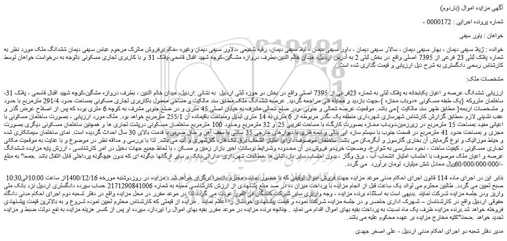 مزایده فروش ششدانگ ملک به شماره پلاک ثبتی 23 فرعی از 7395 اصلی , مزایده فروش ششدانگ ملک به شماره پلاک ثبتی 23 فرعی از 7395 اصلی