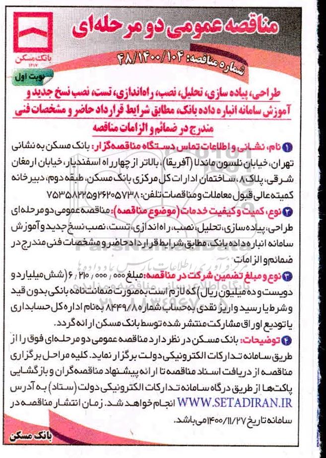4. توضیحات: بانک مسکن در نظر دارد مناقصه عمومی دو مرحله ای فوق را از طریق سامانه تدارکات الکترونیکی دولت برگزار نماید.کلیه مراحل برگزاری مناقصه از دریافت اسناد مناقصه تا ارائه پیشنهاد مناقصه گران و بازگشایی پاکتها از طریق درگاه سامانه تدارکات الکترونیکی دولت (ستاد) به آدرس ستاد انجام خواهد شد
