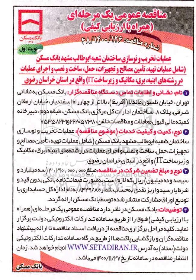 2. نوع، کمیت و کیفیت خدمات (موضوع مناقصه): عملیات تخریب و نوسازی ساختمان شعبه ابوطالب مشهد بانک مسکن شامل عملیات تهیه تامین مصالح و تجهیزات حمل ساخت و نصب و اجرای عملیات در رشته های ابنیه ، برق ، مکانیک و زیرساخت IT واقع در استان خراسان رضوی