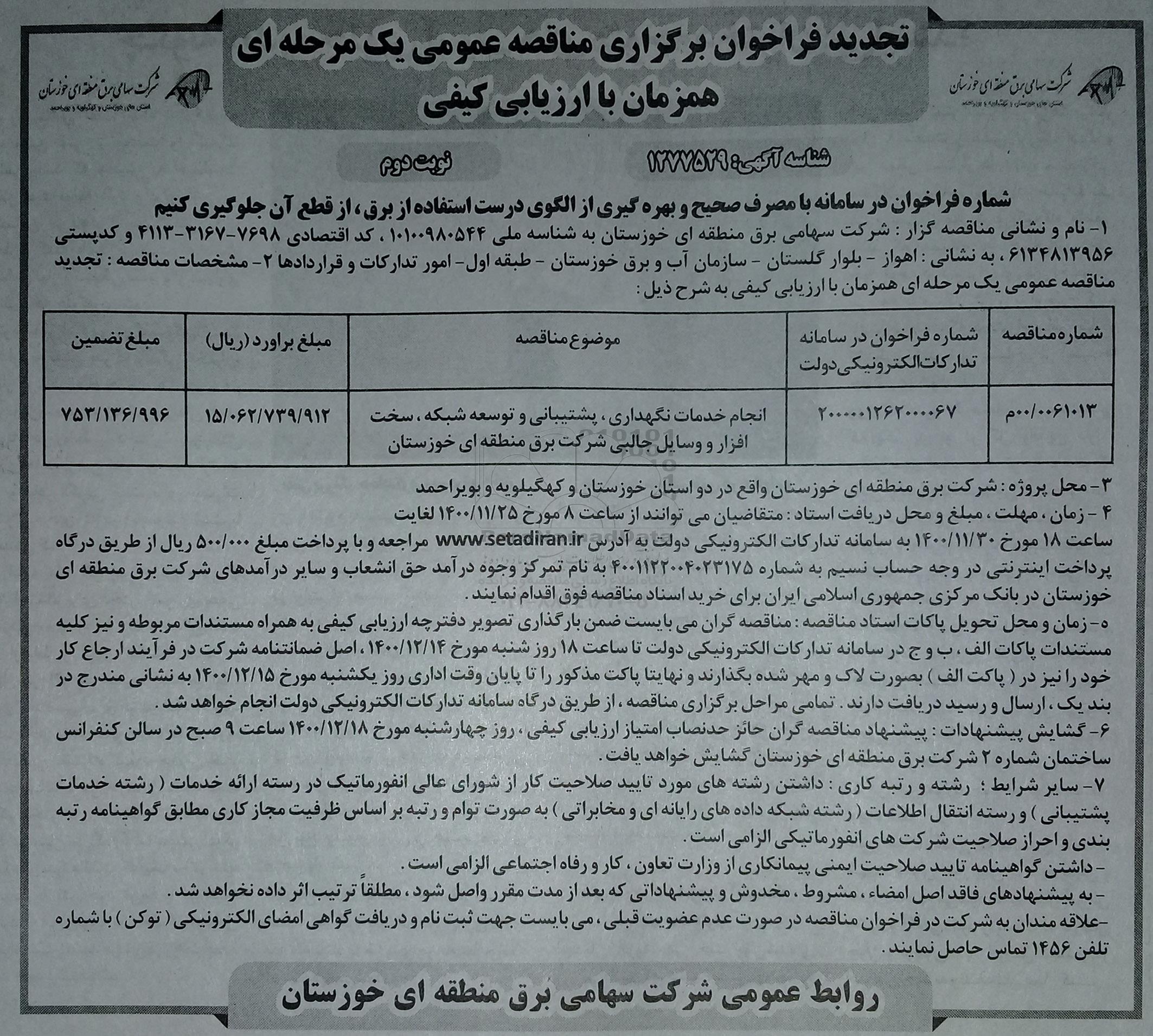00/0061013/م   2000001262000067 انجام خدمات نگهداری، پشتیبانی و توسعه شبکه، سخت افزار و وسایل جانبی شرکت برق منطقه ای خوزستان 15.062.739.912 753.136.996