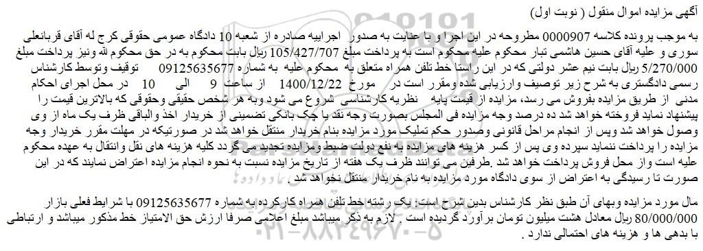 به موجب پرونده کلاسه 0000907 مطروحه در این اجرا و با عنایت به صدور  اجراییه صادره از شعبه 10 دادگاه عمومی حقوقی کرج له آقای قربانعلی سوری و علیه آقای حسین هاشمی تبار محکوم علیه محکوم است به پرداخت مبلغ 105/427/707 ریال بابت محکوم به در حق محکوم لله ونیز پرداخت مبلغ 5/270/000 ریال بابت نیم عشر دولتی که در این راستا خط تلفن همراه متعلق به  محکوم علیه  به شماره 09125635677      توقیف وتوسط کارشناس رسمی دادگستری به شرح زیر توصیف وارزیابی شده ومقرر است در    مورخ  1400/12/22    از ساعت  9      الی      10    در محل اجرای احکام  مدنی  از طریق مزایده بفروش می رسد، مزایده از قیمت پایه    نظریه کارشناسی  شروع می شود وبه هر شخص حقیقی وحقوقی که بالاترین قیمت را پیشنهاد نماید فروخته خواهد شد ده درصد وجه مزایده فی المجلس بصورت وجه نقد یا چک بانکی تضمینی از خریدار اخذ والباقی ظرف یک ماه از وی وصول خواهد شد وپس از انجام مراحل قانونی وصدور حکم تملیک مورد مزایده بنام خریدار منتقل خواهد شد در صورتیکه در مهلت مقرر خریدار وجه مزایده را پرداخت ننماید سپرده وی پس از کسر هزینه های مزایده به نفع دولت ضبط ومزایده تجدید می گردد کلیه هزینه های نقل وانتقال به عهده محکوم علیه است واز محل فروش پرداخت خواهد شد .طرفین می توانند ظرف یک هفته از تاریخ مزایده نسبت به نحوه انجام مزایده اعتراض نمایند که در این صورت تا رسیدگی به اعتراض از سوی دادگاه مورد مزایده به نام خریدار منتقل نخواهد شد .