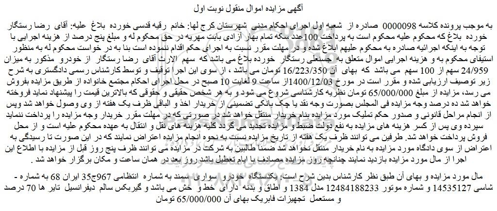 به موجب پرونده کلاسه 0000098 صادره از شعبه اول اجرای احکام مدنی شهرستان کرج لها: خانم رقیه قدسی خورده بلاغ علیه: آقای رضا رستگار خورده بلاغ که محکوم علیه محکوم است به پرداخت 100عدد سکه تمام بهار آزادی بابت مهریه در حق محکوم له و مبلغ پنج درصد از هزینه اجرایی با توجه به اینکه اجرائیه صادره به محکوم علیهم ابلاغ شده و در مهلت مقرر نسبت به اجرای حکم اقدام ننموده است بنا به در خواست محکوم له به منظور استیفای محکوم به و هزینه اجرایی اموال متعلق به جسنعلی رستگار خورده بلاغ می باشد که سهم الارث آقای رضا رستگار از خودرو مذکور به میزان 24/959 سهم از 100 سهم می باشد که بهای آن 16/223/350 تومان می باشد ، از سوی این اجرا توقیف و توسط کارشناس رسمی دادگستری به شرح زیر توصیف ارزیابی شده و مقرر است در مورخ 1400/12/03از ساعت 9 لغایت 10 صبح در محل اجرای احکام مجتمع خانواده از طریق مزایده بفروش می رسد، مزایده از مبلغ 65/000/000 تومان نظریه کارشناسی شروع می شود و به هر شخص حقیقی و حقوقی که بالاترین قیمت را پیشنهاد نماید فروخته خواهد شد ده درصد وجه مزایده فی المجلس بصورت وجه نقد یا چک بانکی تضمینی از خریدار اخذ و الباقی ظرف یک هفته از وی وصول خواهد شد وپس از انجام مراحل قانونی و صدور حکم تملیک مورد مزایده بنام خریدار منتقل خواهد شد در صورتی که در مهلت مقرر خریدار وجه مزایده را پرداخت ننماید سپرده وی پس از کسر هزینه های مزایده به نفع دولت ضبط و مزایده تجدید می گردد کلیه هزینه های نقل و انتقال به عهده محکوم علیه است و از محل فروش پرداخت خواهد شد. طرفین می توانند ظرف یک هفته از تاریخ مزایده نسبت به نحوه انجام مزایده اعتراض نمایند که در این صورت تا رسیدگی به اعتراض از سوی دادگاه مورد مزایده به نام خریدار منتقل نخواهد شد ضمنا طالبین به شرکت در مزایده می توانند ظرف پنج روز قبل از مزایده با اطلاع این اجرا از مال مورد مزایده بازدید نمایند چنانچه روز مزایده مصادف با ایام تعطیل باشد روز بعد در همان ساعت و مکان برگزار خواهد شد .