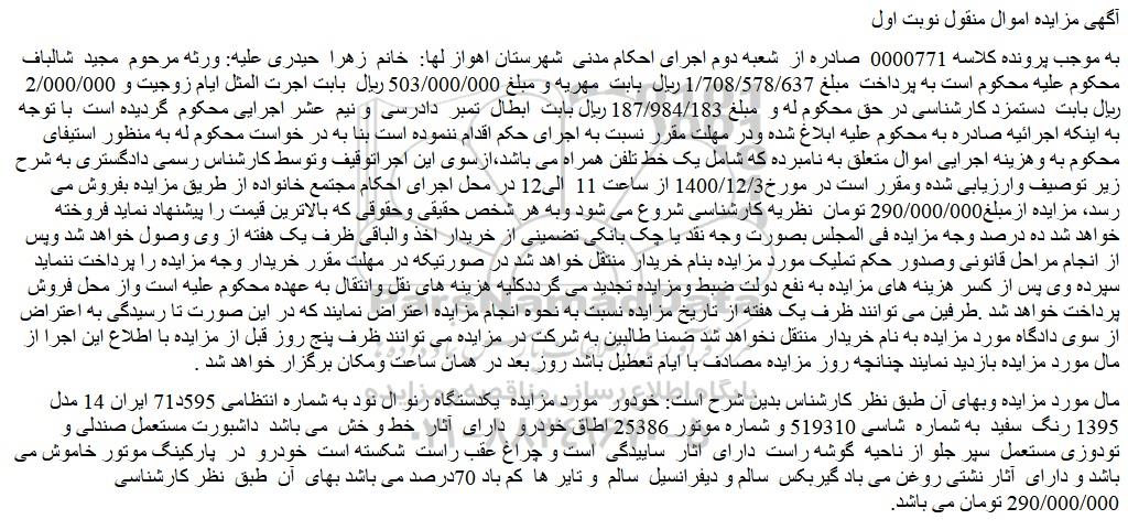 به موجب پرونده کلاسه 0000771 صادره از شعبه دوم اجرای احکام مدنی شهرستان اهواز لها: خانم زهرا حیدری علیه: ورثه مرحوم مجید شالباف محکوم علیه محکوم است به پرداخت مبلغ 1/708/578/637 ریال بابت مهریه و مبلغ 503/000/000 ریال بابت اجرت المثل ایام زوجیت و 2/000/000 ریال بابت دستمزد کارشناسی در حق محکوم له و مبلغ 187/984/183 ریال بابت ابطال تمبر دادرسی و نیم عشر اجرایی محکوم گردیده است با توجه به اینکه اجرائیه صادره به محکوم علیه ابلاغ شده ودر مهلت مقرر نسبت به اجرای حکم اقدام ننموده است بنا به در خواست محکوم له به منظور استیفای محکوم به وهزینه اجرایی اموال متعلق به نامبرده که شامل یک خط تلفن همراه می باشد،ازسوی این اجراتوقیف وتوسط کارشناس رسمی دادگستری به شرح زیر توصیف وارزیابی شده ومقرر است در مورخ1400/12/3 از ساعت 11 الی12 در محل اجرای احکام مجتمع خانواده از طریق مزایده بفروش می رسد، مزایده ازمبلغ290/000/000 تومان نظریه کارشناسی شروع می شود وبه هر شخص حقیقی وحقوقی که بالاترین قیمت را پیشنهاد نماید فروخته خواهد شد ده درصد وجه مزایده فی المجلس بصورت وجه نقد یا چک بانکی تضمینی از خریدار اخذ والباقی ظرف یک هفته از وی وصول خواهد شد وپس از انجام مراحل قانونی وصدور حکم تملیک مورد مزایده بنام خریدار منتقل خواهد شد در صورتیکه در مهلت مقرر خریدار وجه مزایده را پرداخت ننماید سپرده وی پس از کسر هزینه های مزایده به نفع دولت ضبط ومزایده تجدید می گرددکلیه هزینه های نقل وانتقال به عهده محکوم علیه است واز محل فروش پرداخت خواهد شد .طرفین می توانند ظرف یک هفته از تاریخ مزایده نسبت به نحوه انجام مزایده اعتراض نمایند که در این صورت تا رسیدگی به اعتراض از سوی دادگاه مورد مزایده به نام خریدار منتقل نخواهد شد ضمنا طالبین به شرکت در مزایده می توانند ظرف پنج روز قبل از مزایده با اطلاع این اجرا از مال مورد مزایده بازدید نمایند چنانچه روز مزایده مصادف با ایام تعطیل باشد روز بعد در همان ساعت ومکان برگزار خواهد شد .