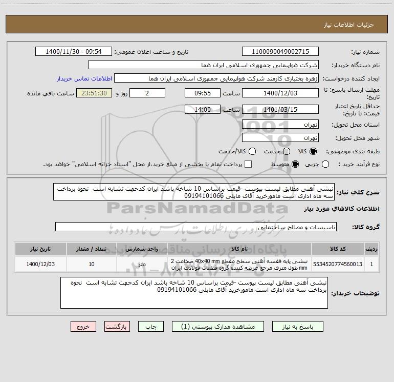 شرح کلی نیاز: نبشی آهنی مطابق لیست پیوست -قیمت براساس 10 شاخه باشد ایران کدجهت تشابه است نحوه پرداخت سه ماه اداری است مامورخرید آقای مایلی 09194101066