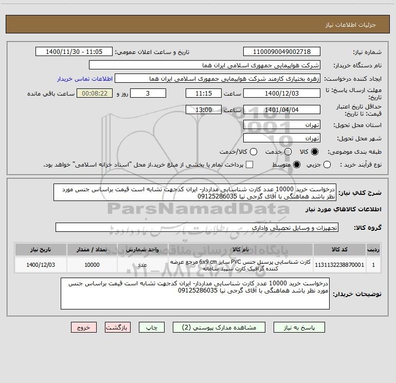 شرح کلی نیاز: درخواست خرید 10000 عدد کارت شناسایی مداردار- ایران کدجهت تشابه است قیمت براساس جنس مورد نظر باشد هماهنگی با آقای گرجی نیا 09125286035