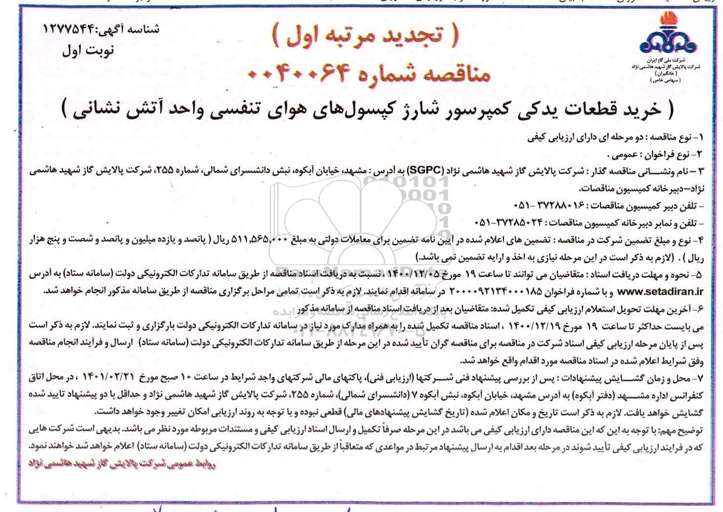 تجدید مناقصه خرید قطعات یدکی کمپرسور شارژ کپسول های هوای تنفسی واحد آتش نشانی از کلیه افراد متخصص و شرکتها واجد شرایط دعوت به عمل میآید در مناقصه با کد خبرگزاری پارس نماد: 4273802 شرکت نمایند.