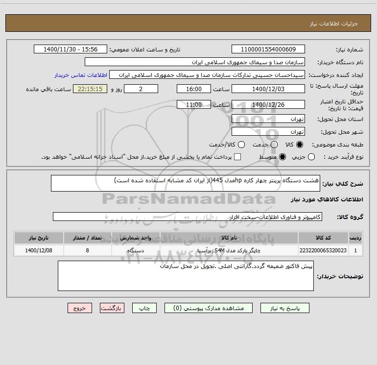 شرح کلی نیاز: هشت دستگاه پرینتر چهار کاره hpمدل 445(از ایران کد مشابه استفاده شده است)