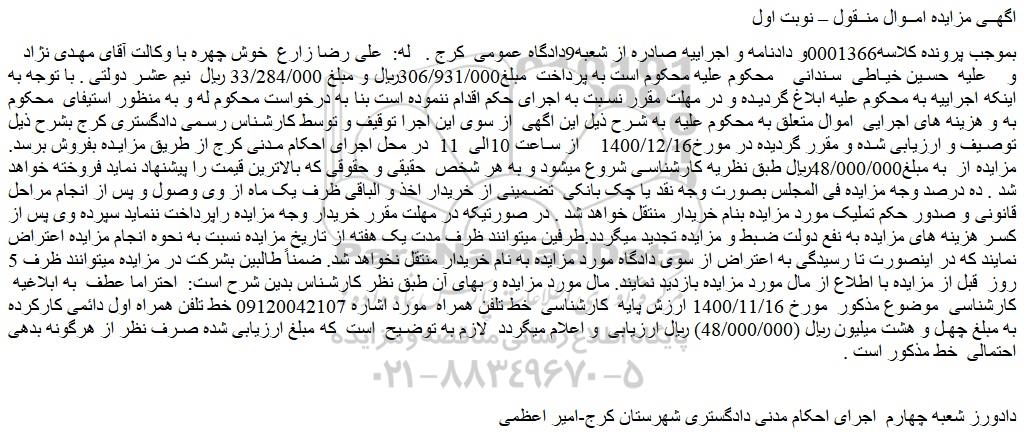 بموجب پرونده کلاسه0001366و دادنامه و اجراییه صادره از شعبه9دادگاه عمومی کرج . له: علی رضا زارع خوش چهره با وکالت آقای مهدی نژاد و علیه حسین خیاطی سندانی محکوم علیه محکوم است به پرداخت مبلغ306/931/000ریال و مبلغ 33/284/000 ریال نیم عشر دولتی . با توجه به اینکه اجراییه به محکوم علیه ابلاغ گردیده و در مهلت مقرر نسبت به اجرای حکم اقدام ننموده است بنا به درخواست محکوم له و به منظور استیفای محکوم به و هزینه های اجرایی اموال متعلق به محکوم علیه به شرح ذیل این اگهی از سوی این اجرا توقیف و توسط کارشناس رسمی دادگستری کرج بشرح ذیل توصیف و ارزیابی شده و مقرر گردیده در مورخ1400/12/16 از ساعت 10الی 11 در محل اجرای احکام مدنی کرج از طریق مزایده بفروش برسد. مزایده از به مبلغ48/000/000ریال طبق نظریه کارشناسی شروع میشود و به هر شخص حقیقی و حقوقی که بالاترین قیمت را پیشنهاد نماید فروخته خواهد شد . ده درصد وجه مزایده فی المجلس بصورت وجه نقد یا چک بانکی تضمینی از خریدار اخذ و الباقی ظرف یک ماه از وی وصول و پس از انجام مراحل قانونی و صدور حکم تملیک مورد مزایده بنام خریدار منتقل خواهد شد . در صورتیکه در مهلت مقرر خریدار وجه مزایده راپرداخت ننماید سپرده وی پس از کسر هزینه های مزایده به نفع دولت ضبط و مزایده تجدید میگردد.طرفین میتوانند ظرف مدت یک هفته از تاریخ مزایده نسبت به نحوه انجام مزایده اعتراض نمایند که در اینصورت تا رسیدگی به اعتراض از سوی دادگاه مورد مزایده به نام خریدار منتقل نخواهد شد. ضمناً طالبین بشرکت در مزایده میتوانند ظرف 5 روز قبل از مزایده با اطلاع از مال مورد مزایده بازدید نمایند. مال مورد مزایده و بهای آن طبق نظر کارشناس بدین شرح است: احتراما عطف به ابلاغیه کارشناسی موضوع مذکور مورخ 1400/11/16 ارزش پایه کارشناسی خط تلفن همراه مورد اشاره 09120042107 خط تلفن همراه اول دائمی کارکرده به مبلغ چهل و هشت میلیون ریال (48/000/000) ریال ارزیابی و اعلام میگردد لازم به توضیح است که مبلغ ارزیابی شده صرف نظر از هرگونه بدهی احتمالی خط مذکور است .
