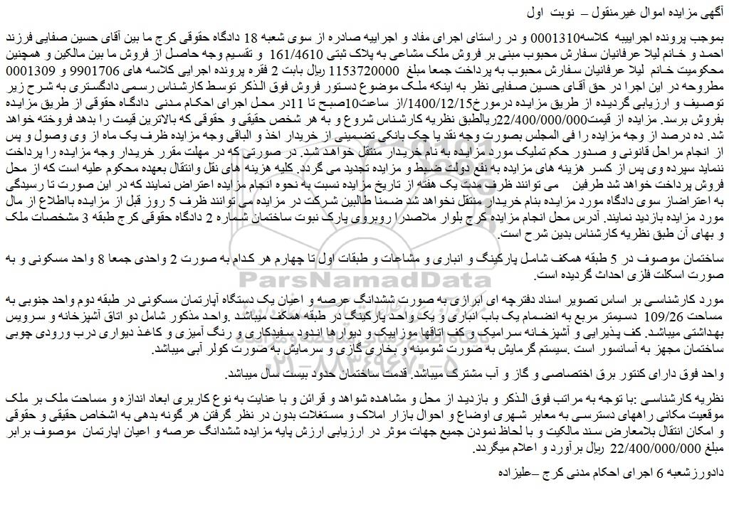 بموجب پرونده اجراییبه کلاسه0001310 و در راستای اجرای مفاد و اجراییه صادره از سوی شعبه 18 دادگاه حقوقی کرج ما بین آقای حسین صفایی فرزند احمد و خانم لیلا عرفانیان سفارش محبوب مبنی بر فروش ملک مشاعی به پلاک ثبتی 161/4610 و تقسیم وجه حاصل از فروش ما بین مالکین و همچنین محکومیت خانم لیلا عرفانیان سفارش محبوب به پرداخت جمعا مبلغ 1153720000 ریال بابت 2 فقره پرونده اجرایی کلاسه های 9901706 و 0001309 مطروحه در این اجرا در حق آقای حسین صفایی نظر به اینکه ملک موضوع دستور فروش فوق الذکر توسط کارشناس رسمی دادگستری به شرح زیر توصیف و ارزیابی گردیده از طریق مزایده درمورخ1400/12/15/از ساعت10صبح تا 11در محل اجرای احکام مدنی دادگاه حقوقی از طریق مزایده بفروش برسد. مزایده از قیمت22/400/000/000ریالطبق نظریه کارشناس شروع و به هر شخص حقیقی و حقوقی که بالاترین قیمت را بدهد فروخته خواهد شد. ده درصد از وجه مزایده را فی المجلس بصورت وجه نقد یا چک بانکی تضمینی از خریدار اخذ و الباقی وجه مزایده ظرف یک ماه از وی وصول و پس از انجام مراحل قانونی و صدور حکم تملیک مورد مزایده به نام خریدار منتقل خواهد شد. در صورتی که در مهلت مقرر خریدار وجه مزایده را پرداخت ننماید سپرده وی پس از کسر هزینه های مزایده به نفع دولت ضبط و مزایده تجدید می گردد. کلیه هزینه های نقل وانتقال بعهده محکوم علیه است که از محل فروش پرداخت خواهد شد طرفین می توانند ظرف مدت یک هفته از تاریخ مزایده نسبت به نحوه انجام مزایده اعتراض نمایند که در این صورت تا رسیدگی به اعتراضاز سوی دادگاه مورد مزایده بنام خریدار منتقل نخواهد شد ضمنا طالبین شرکت در مزایده می توانند ظرف 5 روز قبل از مزایده بااطلاع از مال مورد مزایده بازدید نمایند. آدرس محل انجام مزایده کرج بلوار ملاصدرا روبروی پارک نبوت ساختمان شماره 2 دادگاه حقوقی کرج طبقه 3 مشخصات ملک و بهای آن طبق نظریه کارشناس بدین شرح است.