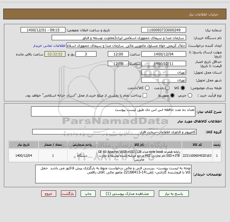 شرح کلی نیاز: تعداد ده عدد حافظه اس اس دی طبق لیست پیوست