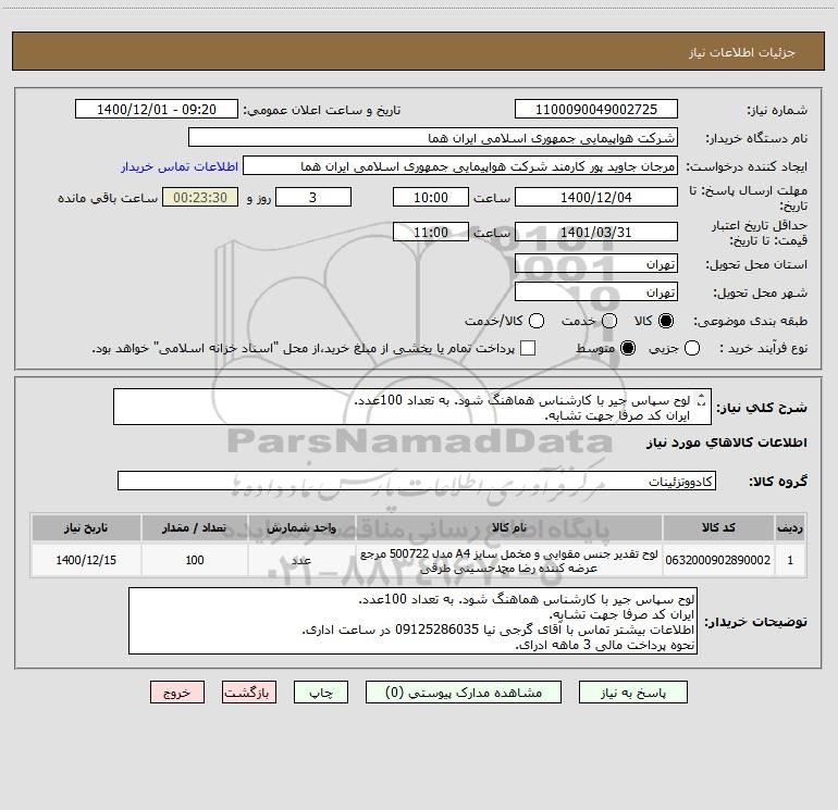 توضیحات خریدار:لوح سپاس جیر با کارشناس هماهنگ شود. به تعداد 100عدد. ایران کد صرفا جهت تشابه. اطلاعات بیشتر تماس با آقای گرجی نیا 09125286035 در ساعت اداری. نحوه پرداخت مالی 3 ماهه ادرای.