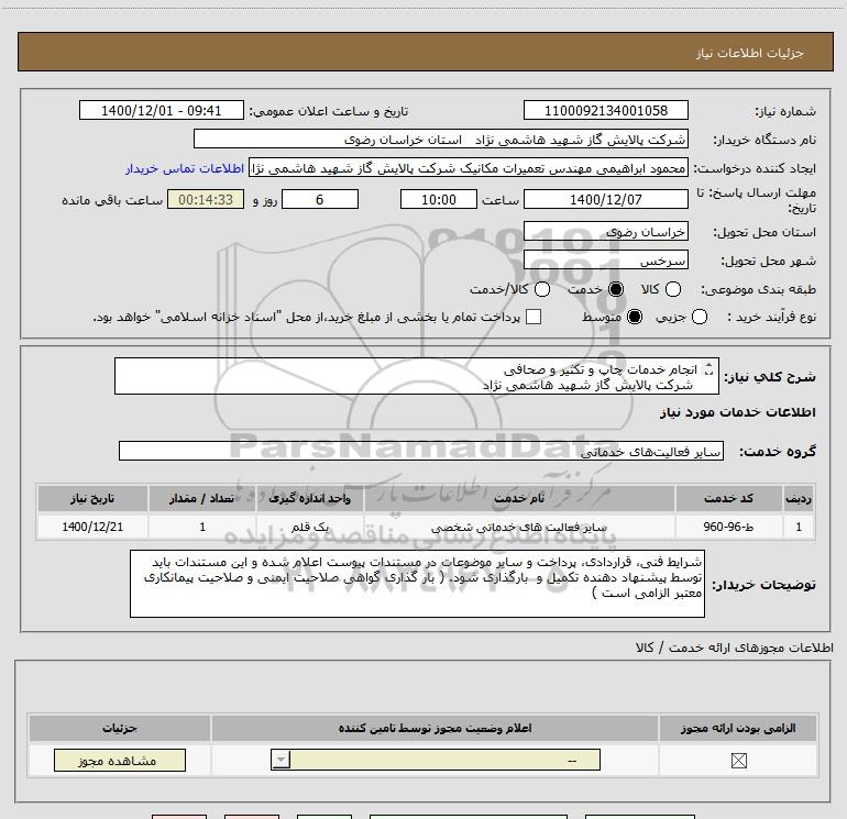 نام دستگاه خریدار:شرکت پالایش گاز شهید هاشمی نژاد استان خراسان رضوی